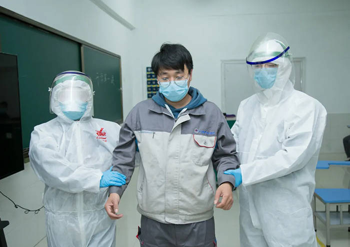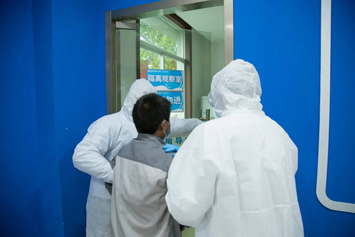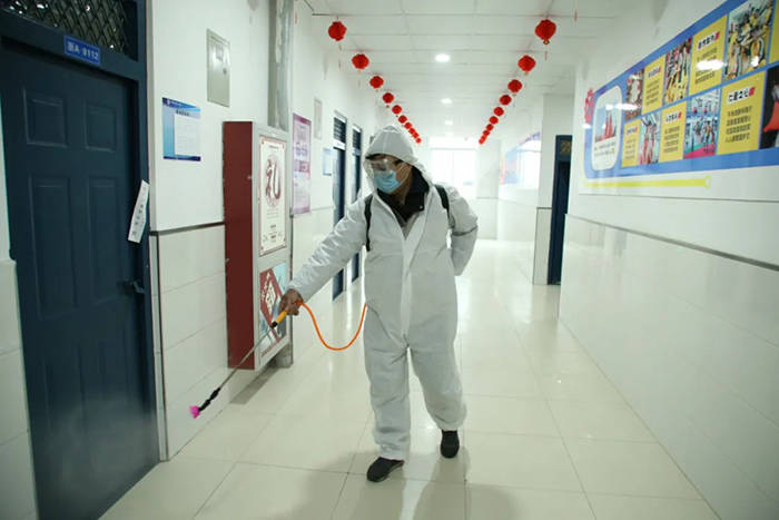 在入寝模拟演练环节。学生入校后,寝室也需重新分配,减少同寝人数。若发现某同学在入睡后,出现发烧、乏力、胸闷等症状。同一寝室同学及时通知宿舍管理员,管理员测量体温后马上联系校方防控组,并测量其他同学体温查看是否正常,做好安抚工作。若测量后该同学体温超过37.3℃,立即上报当地医院送医救治。同时,班主任及宿舍管理员引导其他同学到备用寝室,消毒人员立即对该寝室进行全面消毒。