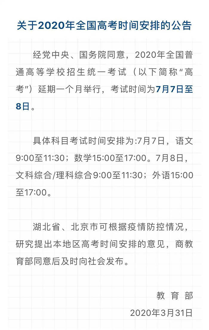 教育部今日下达通知,2020年高考时间推迟一个月,考试时间为7月7日至8日,湖北省、北京市高考时间依旧待定。