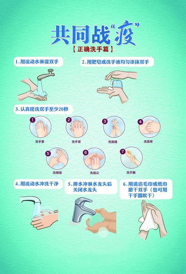 在餐前、便后、回宿舍、接触垃圾、抚摸动物后,记得洗手。洗手时注意使用流动水和肥皂或洗手液彻底清洗双手,揉搓时间不少于20秒。为了方便记忆,揉搓步骤简单归纳为七字口诀:内-外-夹-弓-大-立-腕。